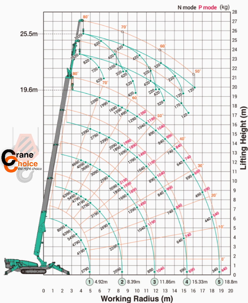 • Excellent working radius: Up to 18.8 m with a rated load of approx. 0.34 t at maximum reach